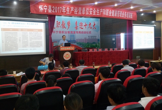 為強化安全生產(chǎn)管理和職業(yè)健康管理業(yè)務,督促用人單位落實安全生產(chǎn)和職業(yè)健康管理主體責任,提高勞動者的安全生產(chǎn)及職業(yè)病防范意識,保障勞動者的身體健康。2017年6月18日,由懷寧縣安全生產(chǎn)監(jiān)督管理局主辦,懷寧縣職教中心承辦的“懷寧縣2017年生產(chǎn)經(jīng)營單位安全生產(chǎn)和職業(yè)健康管理業(yè)務培訓班”成功在該??萍即髽桥嘤柎髲d隆重開班。懷寧縣安監(jiān)局副局長余向陽、懷寧縣職教中心校長郝浩軍等出席了開班儀式。懷寧縣工業(yè)區(qū)以及各鄉(xiāng)鎮(zhèn)企業(yè)負責人、安全管理人員和職業(yè)健康管理人員約350人參加了本次培訓班。