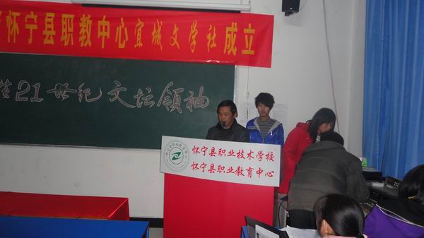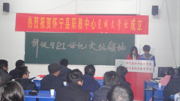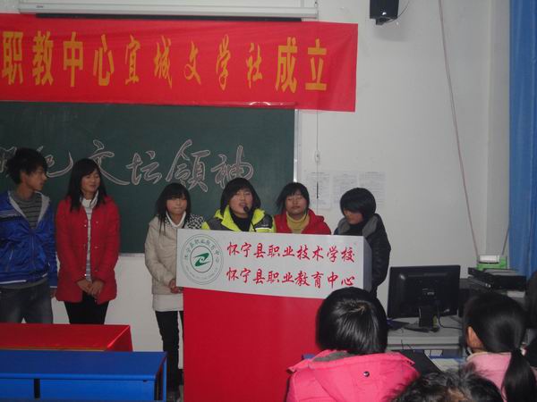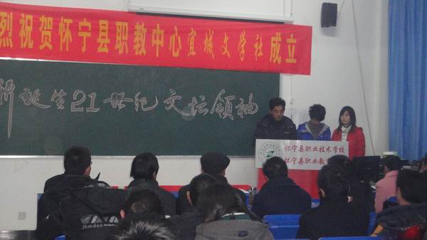 2010年12月26日,懷寧縣職教中心宜城文學(xué)社成立大會在校多功能廳隆重召開。在校領(lǐng)導(dǎo)的大力支持和幫助下,由校團委主辦,經(jīng)過長時間的醞釀和籌備,宜城文學(xué)社終于成立了。