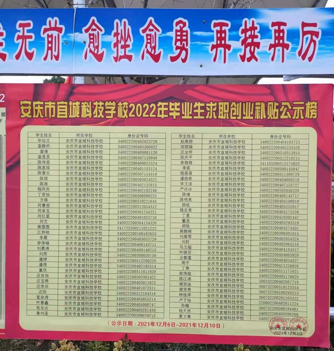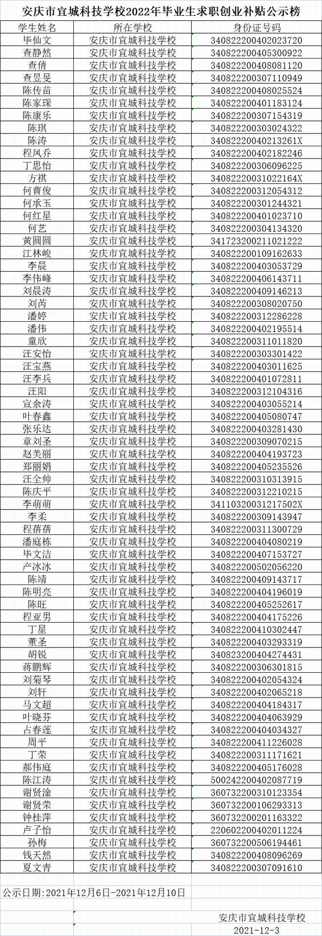安慶市宜城科技學(xué)校2022年畢業(yè)生求職創(chuàng)業(yè)補(bǔ)貼公示