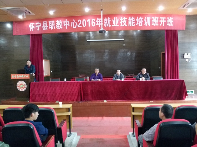 近日,懷寧縣職教中心在學??萍即髽桥嘤柎髲d舉辦就業(yè)技能培訓班,百余名學生參加了開班典禮儀式??h人社局領導,學校常務副校長郝浩軍,副校長肖國林等出席了開班儀式,開班儀式由肖國林校長主持。