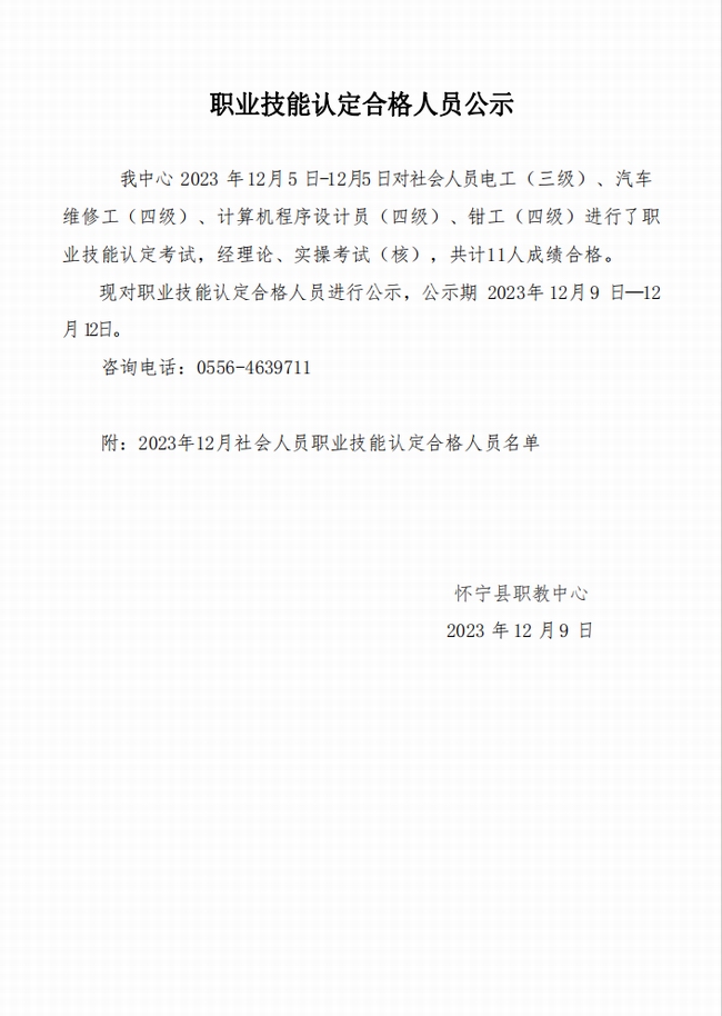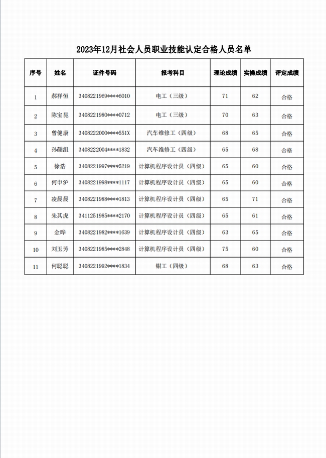 職業(yè)培訓(xùn)-2023年12月社會(huì)人員職業(yè)技能認(rèn)定合格人員名單公示